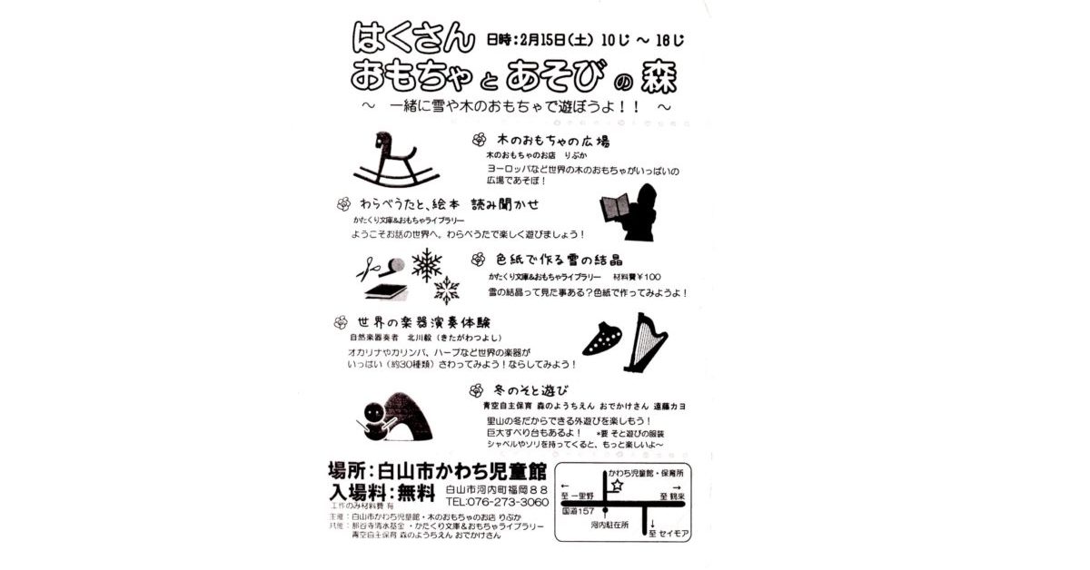 トップ お知らせ 第1回はくさんおもちゃとあそびの森 第1回はくさんおもちゃとあそびの森 石川県白山市河内町の白山市かわち児童館にて、はくさんおもちゃとあそびの森実行委員会として、初めて主催したイベントです。 初めてにもかかわらず、約250名の来場があり、スタッフもなれない中で一生懸命子供たちの遊びのサポートをさせていただきました。 白山ろくでなかなかこのようなイベントは行われないので、継続して、より多くのみなさんに白山ろくの魅力を、おもちゃと遊びを通じて広めていきたいと思っています。よろしくお願いいたします。